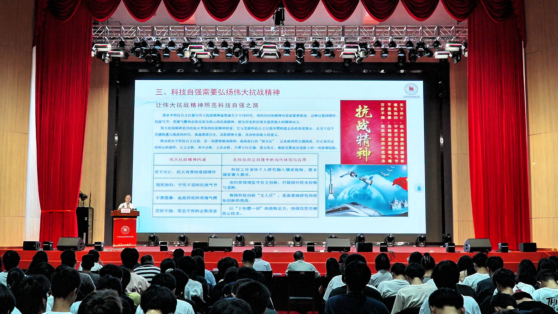 9月16日,廣州華立科技職業(yè)學(xué)院云浮校區(qū)文體樓8樓報(bào)告廳內(nèi)座無虛席,氣氛莊重而熱烈。學(xué)校黨委書記陳良聲同志以“傳承和弘揚(yáng)偉大抗戰(zhàn)精神,讓青春在實(shí)現(xiàn)高水平科技自立自強(qiáng)中綻放光芒”為題,圍繞“關(guān)于科技創(chuàng)新的重要論述、我國科技創(chuàng)新的當(dāng)代成就、科技自強(qiáng)需弘揚(yáng)抗戰(zhàn)精神、在科技自立中譜寫新華章”四個(gè)方面內(nèi)容,為2025級(jí)新生代表講授了一堂深刻而精彩的秋季學(xué)期“思政第一課”。這堂思政課不僅是一次思想的洗禮,更是一次奮進(jìn)的動(dòng)員,深刻闡述了偉大抗戰(zhàn)精神的時(shí)代價(jià)值,并將其與當(dāng)代青年學(xué)子的歷史使命、與國家實(shí)現(xiàn)高水平科技自立自強(qiáng)緊密相連。