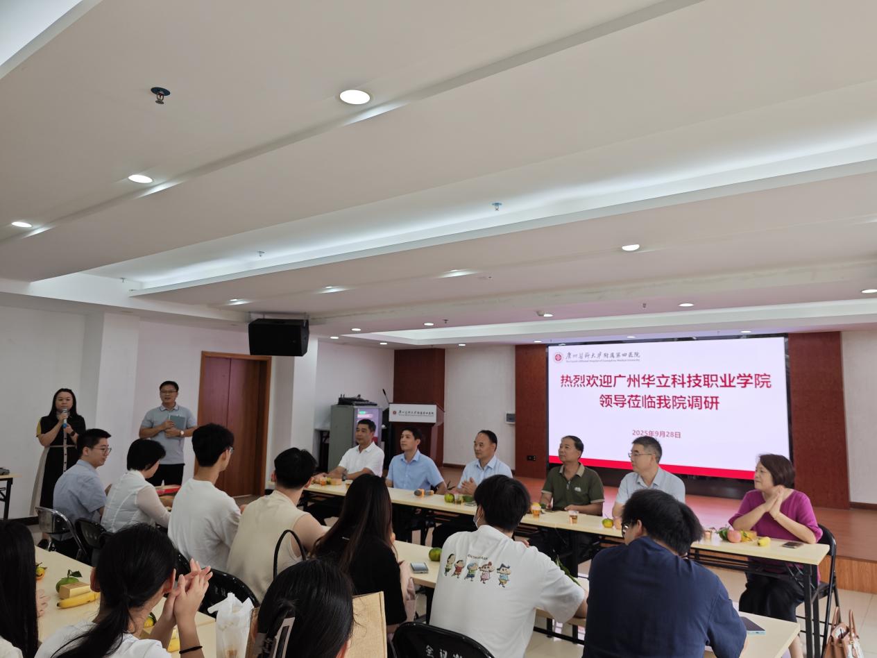 在國慶、中秋雙節(jié)來臨之際,2025年9月28日下午,我校廖俊杰校長、教務(wù)處孫麗英處長、實踐教學(xué)科韋建林科長、健康學(xué)院雷毅雄院長、李國良副院長、行政主任梁瑞云、實習指導(dǎo)老師鄧香華、楊鵬一行赴廣州醫(yī)科大學(xué)附屬第四醫(yī)院訪企拓崗,給健康學(xué)院2023級在該醫(yī)院進行臨床實習的華立學(xué)子們送去節(jié)日的關(guān)懷。廣州醫(yī)科大學(xué)附屬第四醫(yī)院郭建軍副院長,科教科劉志毅副科長、陳彩青科護長,張琴口腔科主任等院領(lǐng)導(dǎo)熱情參與了中秋慰問活動。