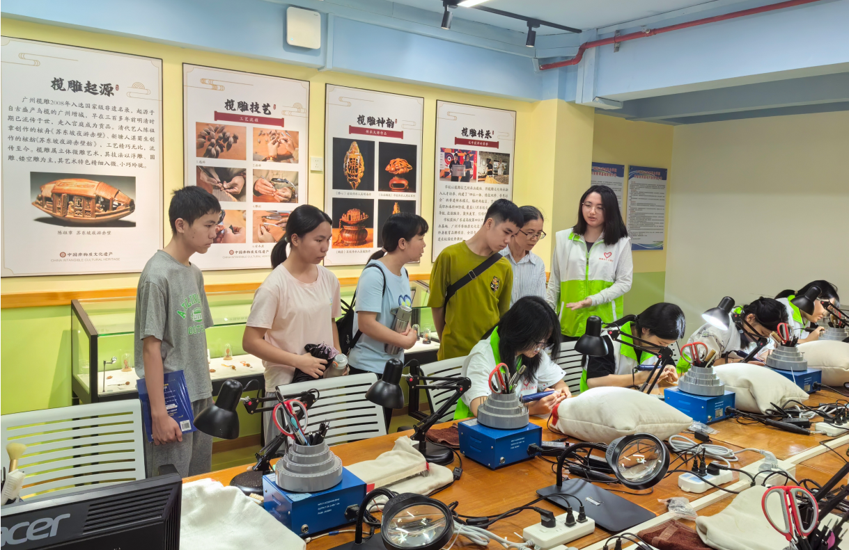 走進(jìn)廣州欖雕館,展柜中陳列的一件件精美欖雕作品吸引著參觀者駐足凝望。通過(guò)講解員的生動(dòng)介紹,欖雕藝術(shù)的千年傳承與獨(dú)特魅力徐徐展開(kāi),讓在場(chǎng)觀眾對(duì)這一嶺南非遺瑰寶有了更深層的認(rèn)知。通過(guò)近距離了解欖雕原材料和觀摩雕刻過(guò)程,在場(chǎng)的所有人慢慢體會(huì)到如何把一顆小小的欖核雕刻成一件絕世佳品的神奇過(guò)程;也讓大家親身感受到傳統(tǒng)技藝的藝術(shù)價(jià)值和文化魅力。