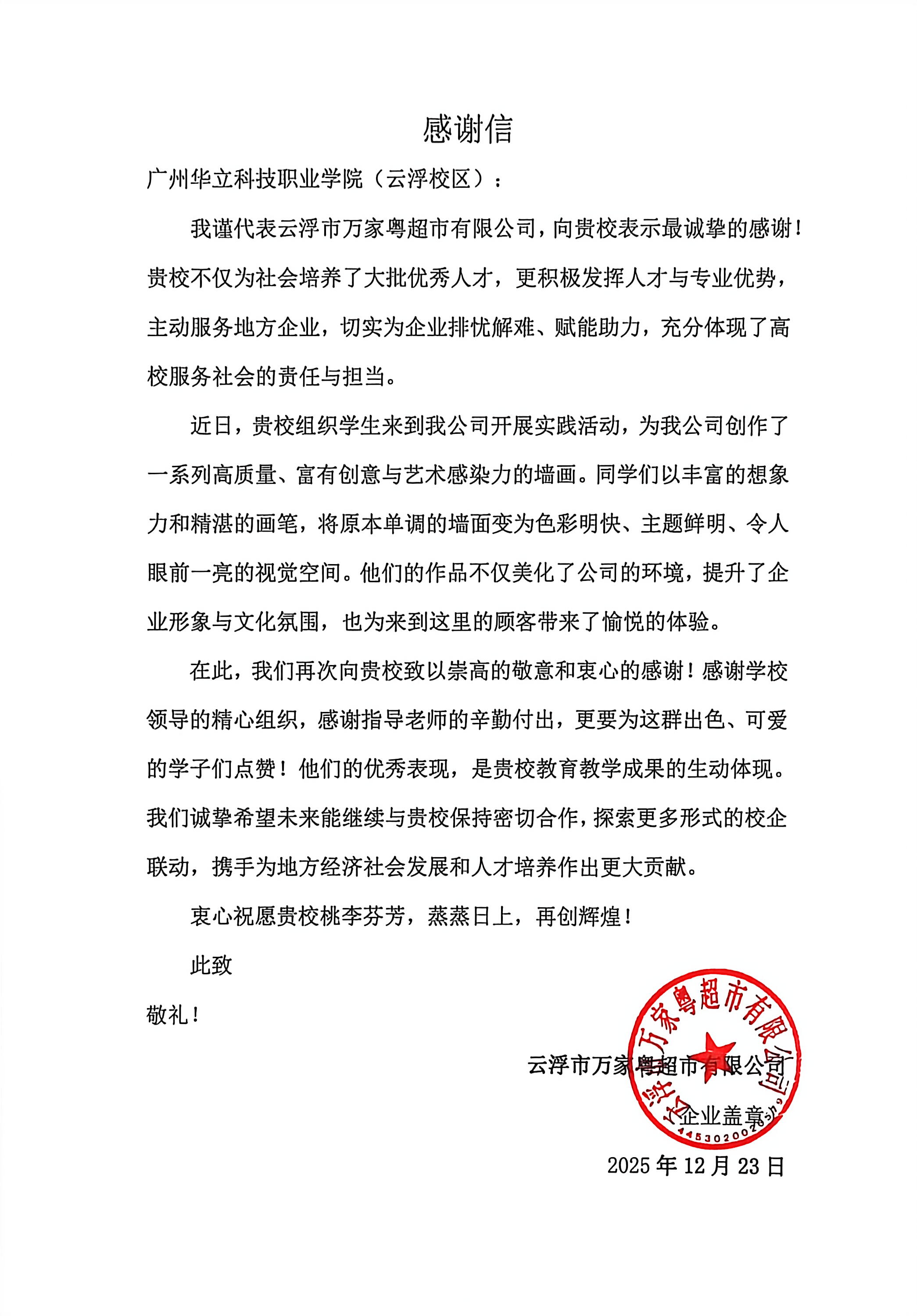 為此,云浮市萬家粵超市有限公司特向?qū)W校發(fā)來感謝信,信中贊譽同學們'想象力豐富、畫筆精湛',作品'提升了企業(yè)形象與文化氛圍',并為顧客帶來愉悅體驗。企業(yè)總經(jīng)理林坤爍指出,此次活動是高校服務地方、校企協(xié)同育人的生動體現(xiàn),充分展現(xiàn)了廣州華立科技職業(yè)學院學子扎實的專業(yè)素養(yǎng)和積極的實踐精神。