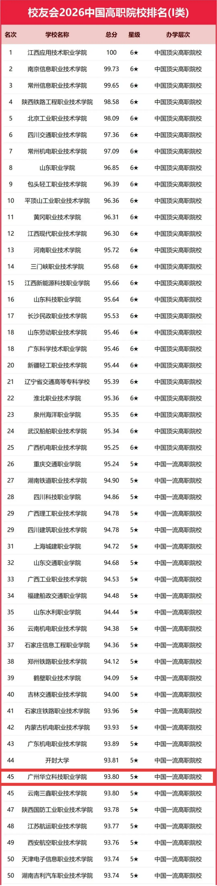 華立職院在校友會(huì)中國排名躍升至第45名,并列5星中國一流高職院校