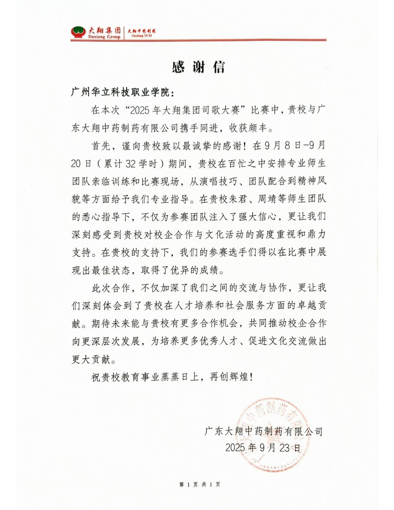 近日,廣東大翔中藥制藥有限公司向廣州華立科技職業(yè)學(xué)院發(fā)來感謝信,致謝我校藝術(shù)與傳媒學(xué)院、教育學(xué)院師生團隊的專業(yè)指導(dǎo),助力其在“大翔集團司歌大賽”中表現(xiàn)優(yōu)異,成為產(chǎn)教融合的又一成功典范。