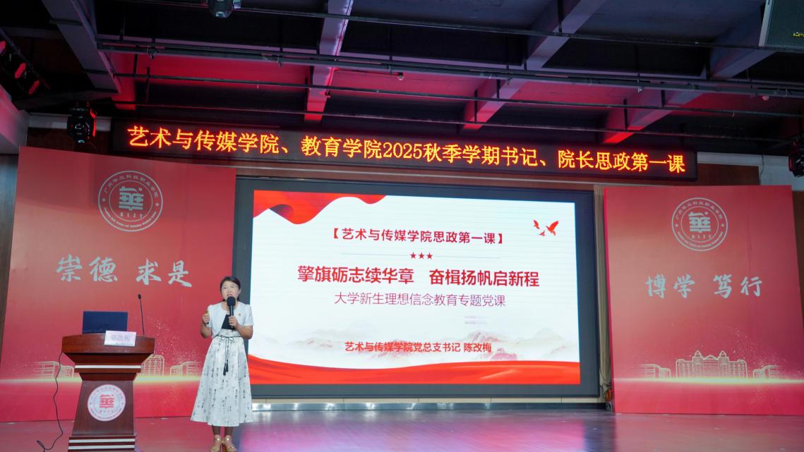為引導(dǎo)和幫助青年學(xué)子學(xué)會用習(xí)近平新時代中國特色社會主義思想的先進理論武裝頭腦,將個人成長與民族復(fù)興緊密相連,扣好人生“第一??圩印?,9月11日晚,藝術(shù)與傳媒學(xué)院黨總支書記陳改梅老師以 “擎旗礪志續(xù)華章 奮楫揚帆啟新程”為主題,在圖書館八樓報告廳,為藝術(shù)與傳媒學(xué)院、教育學(xué)院新生帶來了情感觸動強烈、思想啟迪深刻的“思政第一課”。學(xué)院院長朱君、教師黨員和2025級新生參加聽課。