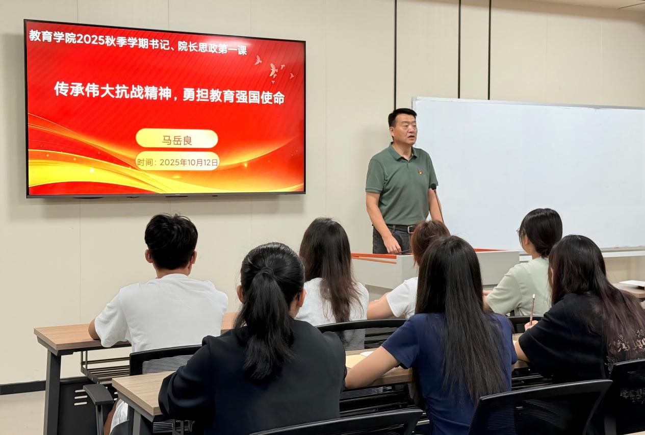 為引導(dǎo)新生厚植家國情懷、明確時代使命,10月12日晚,教育學(xué)院黨總支書記、院長馬岳良教授,以“傳承偉大抗戰(zhàn)精神,勇?lián)逃龔妵姑睘橹黝},從“銘記歷史、錘煉作風、明確使命”三個方面,為2025級學(xué)前教育、體育教育、美術(shù)教育專業(yè)新生們帶來了一堂兼具思想深度與實踐指導(dǎo)意義的思政第一課。