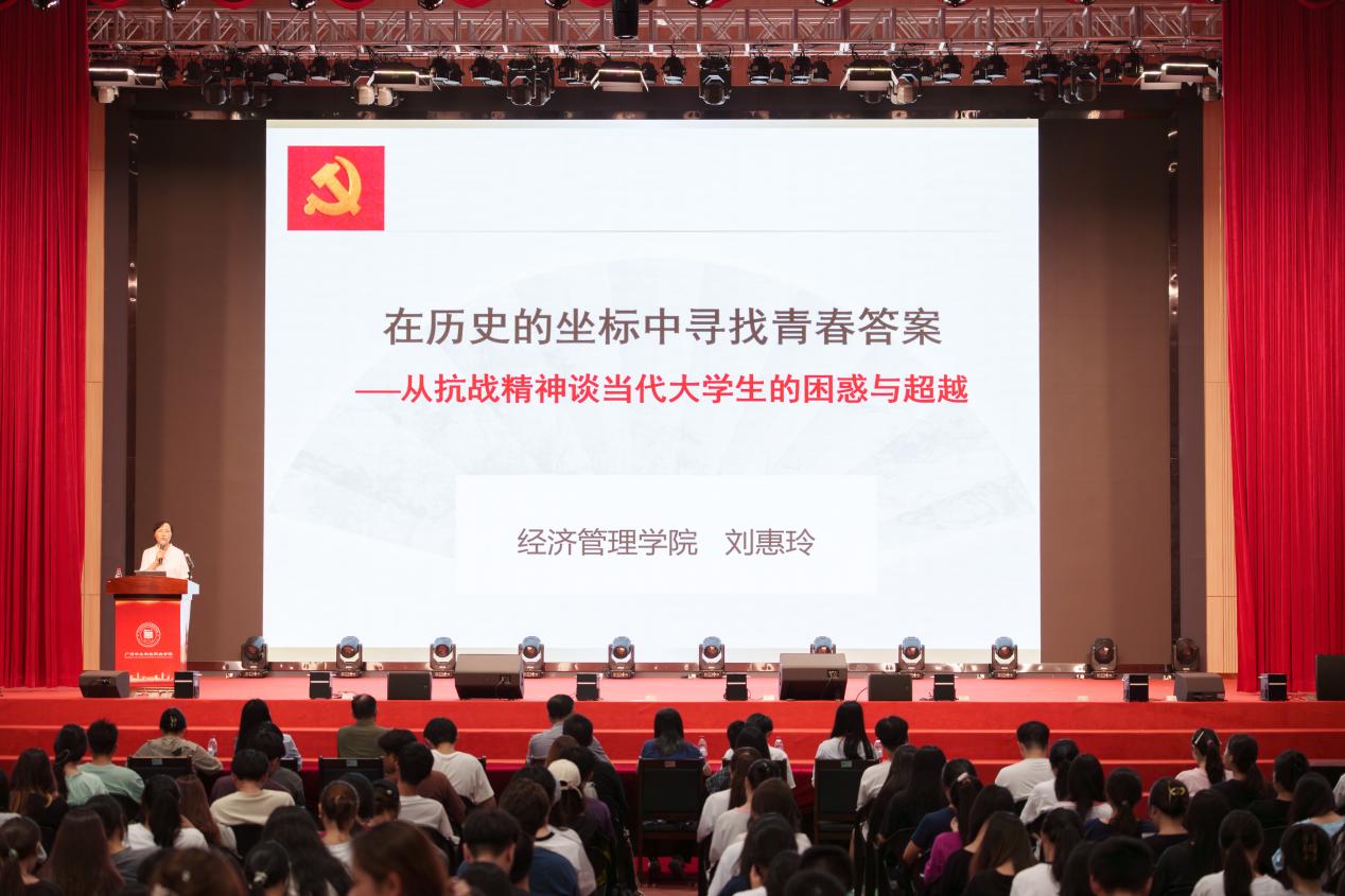 10月13日下午,經(jīng)濟管理學院黨總支書記、院長劉惠玲以《在歷史的坐標中尋找青春答案——從抗戰(zhàn)精神談當代大學生的困惑與超越》為題,為經(jīng)管學院云浮校區(qū)全體新生講授“思政第一課”。