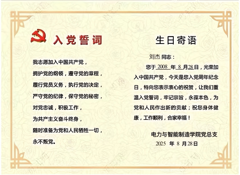 劉杰是電力與智能制造學院教師黨支部的一名教師黨員,8月28日早上,她收到了學院黨組織發(fā)來的“政治生日”賀卡。轉(zhuǎn)眼間,加入中國共產(chǎn)黨已經(jīng)17年。
