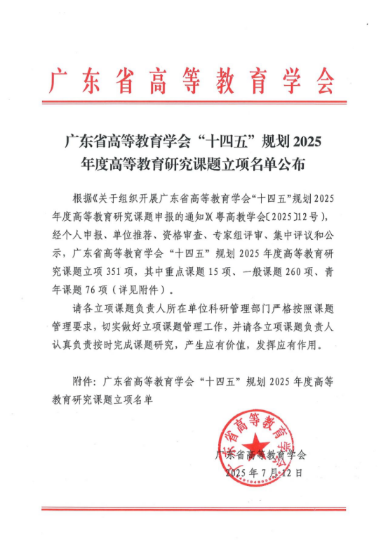 2025年7月12日,《廣東省高等教育學會“十四五”規(guī)劃2025年度高等教育研究課題擬立項名單公示》發(fā)布,我校獲得6項立項,其中,重點課題1項,一般課題5項,青年課題1項。
