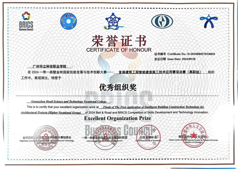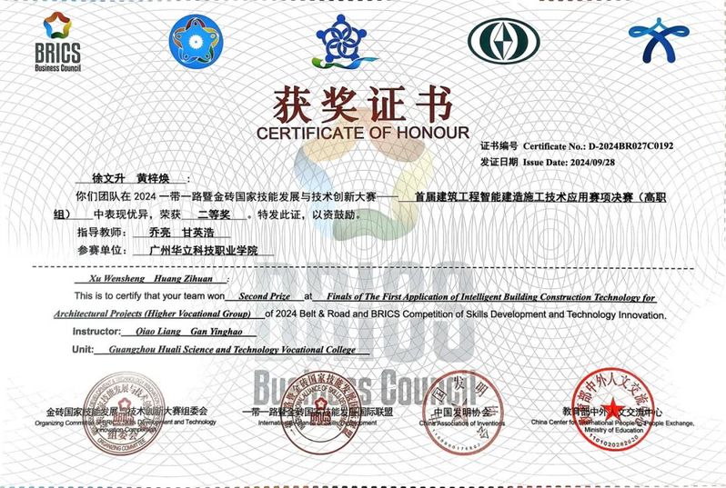 近日,2024一帶一路暨金磚國家技能發(fā)展與技術(shù)創(chuàng)新大賽首屆建筑工程智能建造施工技術(shù)應(yīng)用賽項(BRICS-ST-027)全國總決賽在浙江杭州舉辦。本次決賽匯聚了來自全國28個地區(qū)382所院校的415支隊伍,共計1500余名優(yōu)秀選手參賽。其中孟加拉國、加納共和國及馬來西亞的6名國際留學(xué)生也參與其中。經(jīng)過激烈角逐,我校城建學(xué)院學(xué)生徐文生、黃梓煥脫穎而出,榮獲全國二等獎的佳績,指導(dǎo)教師喬亮、甘英浩被授予“優(yōu)秀指導(dǎo)教師”榮譽稱號,此外,我校憑借前期周密細致的組織工作,贏得了組委會的高度認可,并榮獲“優(yōu)秀組織獎”。