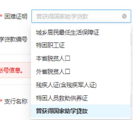 5.助學(xué)貸款合同編號:選擇困難證明為曾獲得國家助學(xué)貸款時則顯示,選擇其它困難證明不顯示