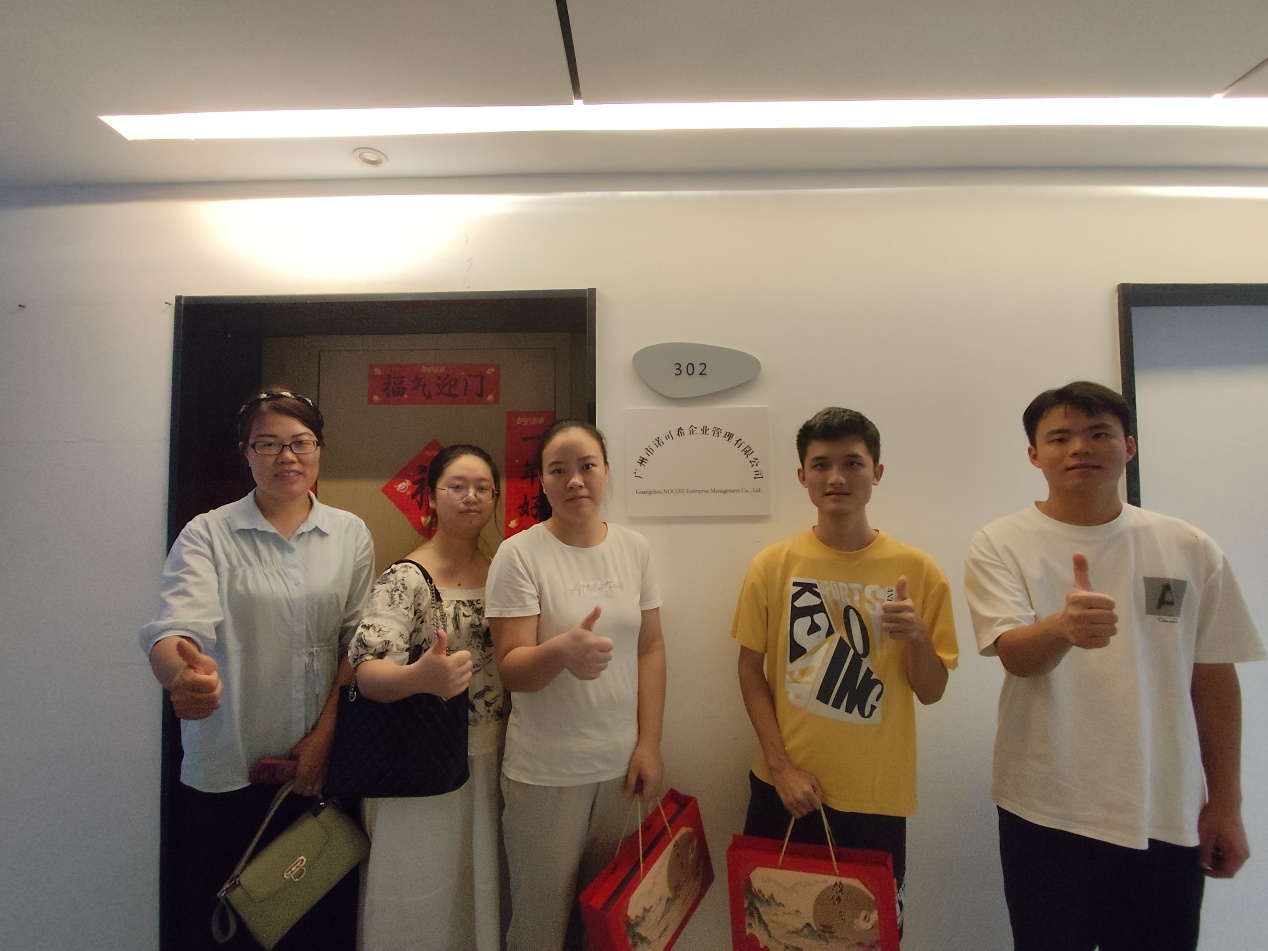 隨后,學(xué)院教師一行前往廣州市諾可希企業(yè)管理有限公司進(jìn)行走訪。公司負(fù)責(zé)人劉曼女士介紹了學(xué)生的崗位實踐安排與表現(xiàn)。在與學(xué)生的座談中,老師們同樣給予了深切關(guān)懷與鼓勵。并代表學(xué)校向實踐學(xué)生分發(fā)了中秋慰問品。