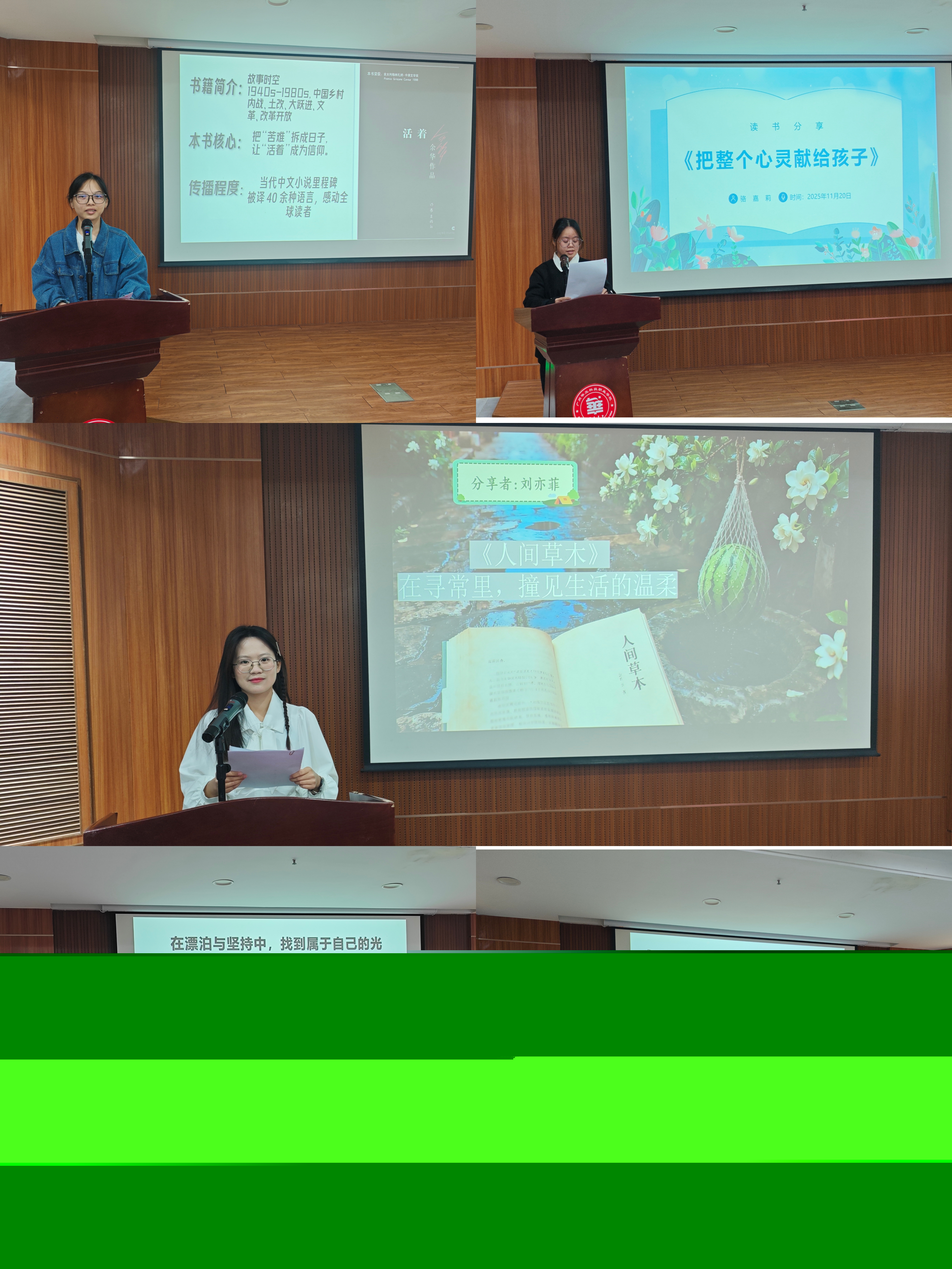 分享會(huì)上,同學(xué)們從不同維度闡釋了閱讀對(duì)教育工作的啟示。孫雅琪同學(xué)通過(guò)《活著》詮釋生命的堅(jiān)韌,強(qiáng)調(diào)教育需要溫度與深度;劉亦菲同學(xué)借《人間草木》分享生活美學(xué),倡導(dǎo)教育應(yīng)充滿煙火氣與詩(shī)意;溫春霞同學(xué)從《云邊有個(gè)小賣部》中體會(huì)陪伴的溫情,認(rèn)為教育是心靈的守望;曾祉瀅同學(xué)通過(guò)《你也走了很遠(yuǎn)的路吧》探討成長(zhǎng)修行,指出教育者是終身學(xué)習(xí)者;駱嘉莉同學(xué)回歸經(jīng)典《把整個(gè)心靈獻(xiàn)給孩子》,強(qiáng)調(diào)教育需要純粹的愛(ài)心。