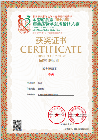 一直以來(lái),學(xué)校領(lǐng)導(dǎo)高度重視教師隊(duì)伍的專業(yè)發(fā)展和教學(xué)水平提升,積極為教師們搭建學(xué)術(shù)交流、競(jìng)賽鍛煉的平臺(tái),定期組織培訓(xùn)與研討,鼓勵(lì)教師參與各類專業(yè)競(jìng)賽與學(xué)術(shù)研究,營(yíng)造了濃厚的學(xué)術(shù)氛圍和良好的創(chuàng)新環(huán)境。此次喜獲佳績(jī),不僅是對(duì)教師個(gè)人能力的肯定,更是學(xué)校持續(xù)推進(jìn)教學(xué)改革與產(chǎn)教融合發(fā)展的生動(dòng)體現(xiàn)。未來(lái),學(xué)校將持續(xù)深化數(shù)字藝術(shù)領(lǐng)域的教學(xué)改革與科研探索,搭建更廣闊的師生發(fā)展平臺(tái),激勵(lì)更多教育工作者與學(xué)子在藝術(shù)與科技的融合之路上勇于突破、再創(chuàng)佳績(jī),助力學(xué)校高質(zhì)量發(fā)展。