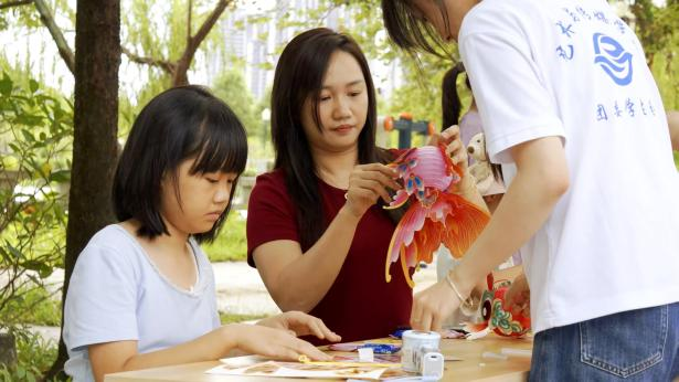 村民們在非遺體驗區(qū)親手嘗試雙節(jié)彩扎魚燈,讓指尖觸碰傳統(tǒng)技藝的溫度;在互動游戲中猜燈謎,讓歡笑裝點團圓的時光。志愿者手把手教學(xué)的同時,穿插講解“非遺中的紅色故事”,將文化傳承與黨建教育巧妙結(jié)合。這些活動背后,是“政校企農(nóng)”協(xié)同創(chuàng)新理念的實踐,更是高校對“以文化人、以美育人”的踐行。