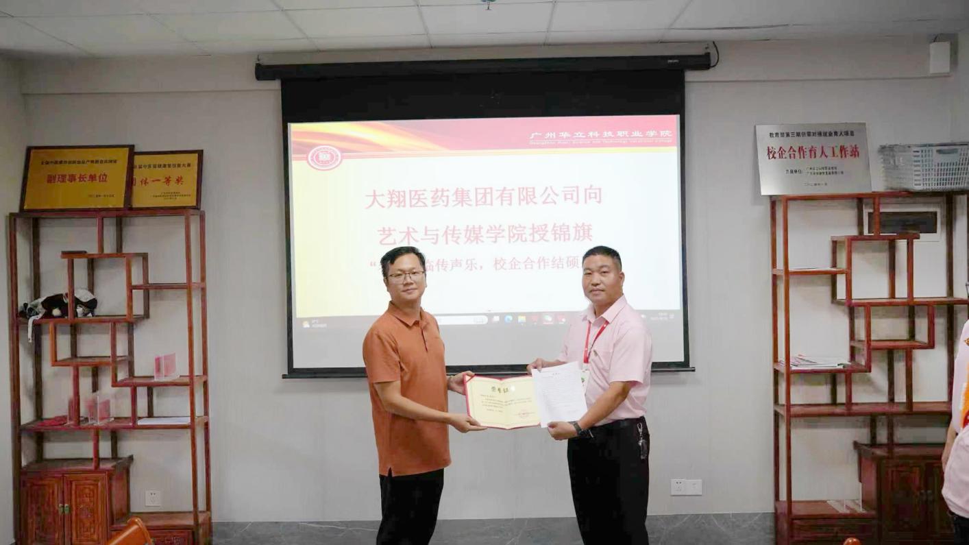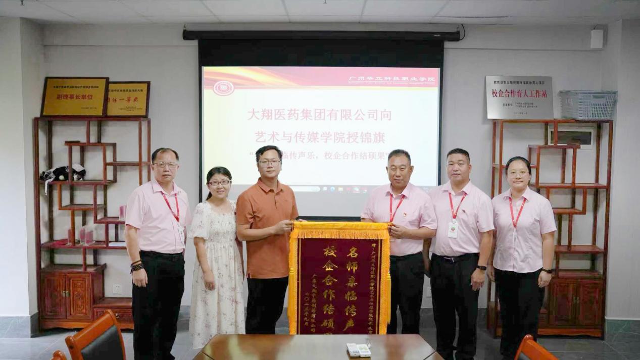 為表達(dá)誠(chéng)摯謝意,大翔中藥向藝術(shù)與傳媒學(xué)院朱君院長(zhǎng)頒發(fā)了榮譽(yù)證書(shū),表彰其以卓越的藝術(shù)造詣和豐富經(jīng)驗(yàn),為大翔中藥企業(yè)文化建設(shè)增添光彩。同時(shí),企業(yè)還向?qū)W院團(tuán)隊(duì)頒發(fā)了錦旗,以感謝師生團(tuán)隊(duì)在本次合作中的突出貢獻(xiàn)。
