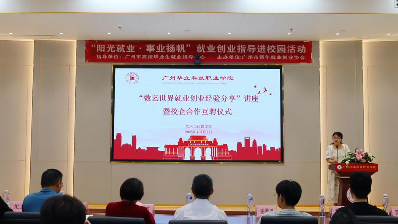 為深化產(chǎn)教融合,拓寬學生就業(yè)創(chuàng)業(yè)視野,2025年10月21日下午,廣州華立科技職業(yè)學院藝術(shù)與傳媒學院與廣州冠岳網(wǎng)絡(luò)科技有限公司在學校圖書館104隆重舉行了“數(shù)藝世界”校企合作簽約授牌互聘儀式暨就業(yè)創(chuàng)業(yè)經(jīng)驗分享會。本次活動得到了校企雙方的高度重視。學校副校長陳顯強、教務(wù)處處長孫麗英、實踐教學科科長韋建林,藝術(shù)與傳媒學院院長朱君、黨總支書記陳改梅等領(lǐng)導老師出席活動。廣州冠岳網(wǎng)絡(luò)科技有限公司謝增福經(jīng)理、黃龍城項目總監(jiān)作為企業(yè)方代表參會。