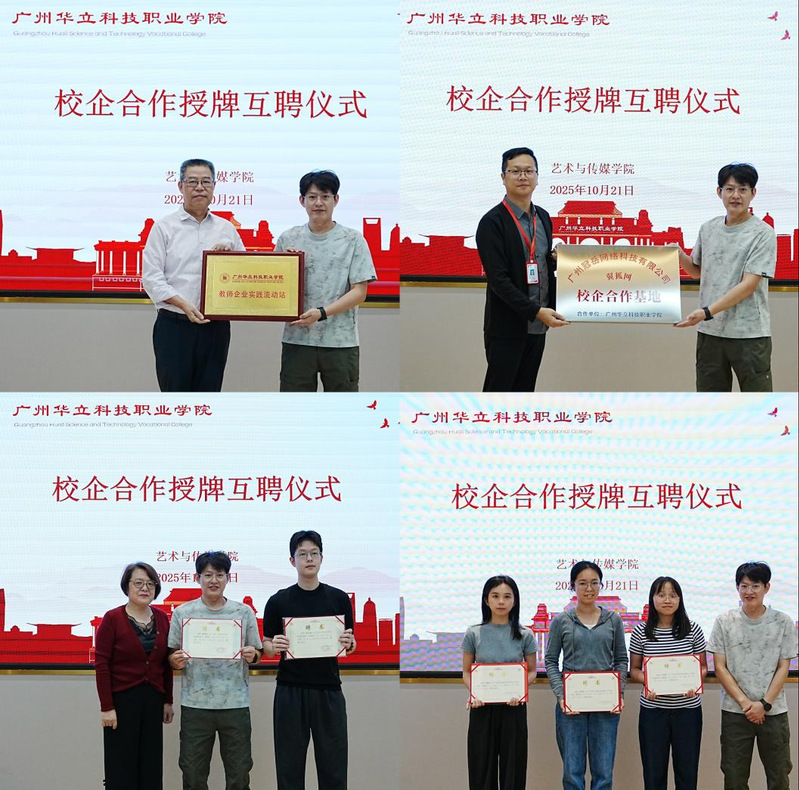 活動在陳改梅書記熱情洋溢的開場中拉開帷幕。首個環(huán)節(jié)是備受矚目的校企合作揭牌互聘儀式。在莊重的氣氛中,陳顯強副校長代表學校向廣州冠岳網(wǎng)絡(luò)科技有限公司授予“教師企業(yè)實踐流動站”牌匾;由朱君院長接受謝增福經(jīng)理向藝術(shù)與傳媒學院授予“產(chǎn)教融合實踐基地”的牌匾。緊接著,雙方進行了隆重的人才互聘儀式:教務(wù)處處長孫麗英為謝增福經(jīng)理、黃龍城項目總監(jiān)頒發(fā)了兼職教師聘書;同時,謝增福經(jīng)理為藝術(shù)與傳媒學院的骨干教師頒發(fā)了企業(yè)導師聘書。這一真正意義上的“雙向奔赴”與人才互動,標志著雙方在人才雙向流動、資源共享、協(xié)同育人方面建立了制度化、常態(tài)化的合作機制。