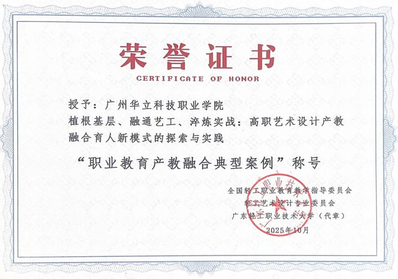 此次研討會是華立職院在藝術設計教育創(chuàng)新和產教融合方面邁出的重要一步。經全國輕工藝術設計專業(yè)委員會和共同體專家評審:由馬俊、肖釗俊、沈泓睿、王渡讀團隊制作的紀錄片榮獲中國大學生廣告藝術學院獎2025年“筑夢產教·校長印記”賽項“金獎”;華立職院產教融合案例“植根基層、融通藝工、淬煉實戰(zhàn):高職藝術設計產教融合育人新模式的探索與實踐”榮獲“產教融合典型案例”;華立職院藝術與傳媒學院黨總支書記陳改梅、就業(yè)主任黎映如獲聘“全國輕工藝術設計專委會智庫專家”;華立職院“冠岳宅吉美項目班”產教融合案例,正式載入《2025年中國廣告年鑒》,以彰顯其行業(yè)價值與引領意義;學校獲評創(chuàng)意星大學生實踐人才培育工程-廣州華立科技職業(yè)學院網易傳媒新媒體人才孵化計劃實訓單位。