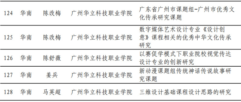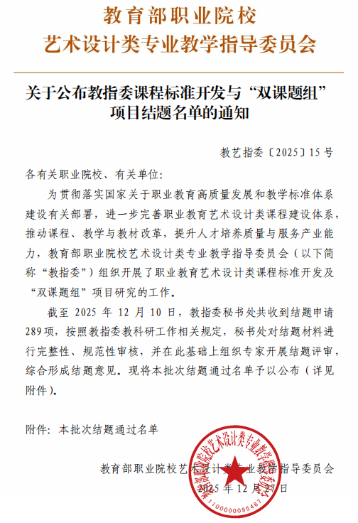近日,教育部職業(yè)院校藝術(shù)設(shè)計類專業(yè)教學(xué)指導(dǎo)委員會正式公布課程標準開發(fā)與“雙課題組”項目結(jié)題名單。廣州華立科技職業(yè)學(xué)院藝術(shù)與傳媒學(xué)院申報的項課題全部通過結(jié)題評審,展現(xiàn)了學(xué)校在職業(yè)教育藝術(shù)設(shè)計類專業(yè)建設(shè)中的扎實成果與創(chuàng)新活力。