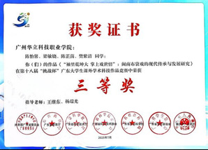 五、2025年7月,在廣東省第十八屆“挑戰(zhàn)杯”大學生課外學術科技作品競賽決賽中,藝傳師生斬獲“挑戰(zhàn)杯”省賽“二等獎”1項,“三等獎”1項,充分展現(xiàn)了藝傳學院青年學子以專業(yè)所學服務鄉(xiāng)村振興戰(zhàn)略的責任擔當與創(chuàng)新實踐,更展現(xiàn)了學校以產(chǎn)教融合助力“百千萬工程”的積極實踐,助力嶺南文化名片在新時代綻放光彩。