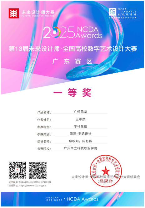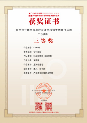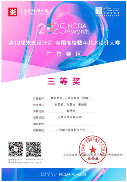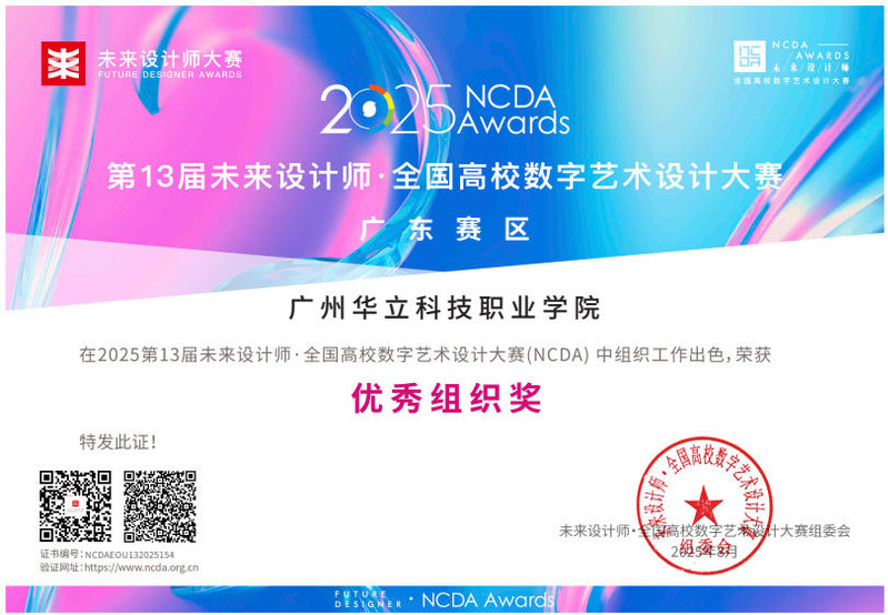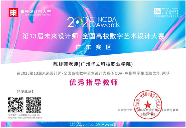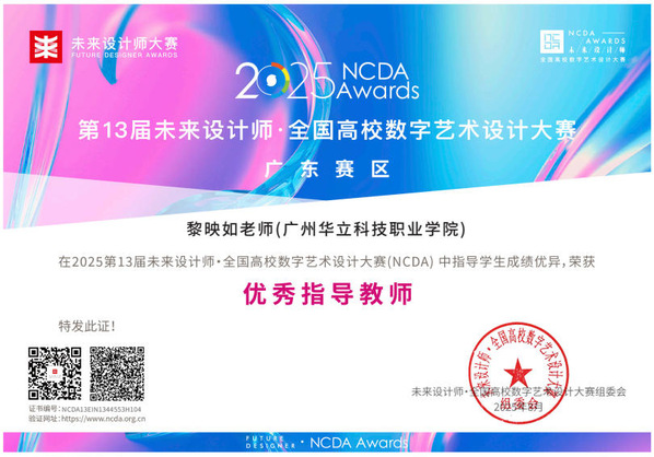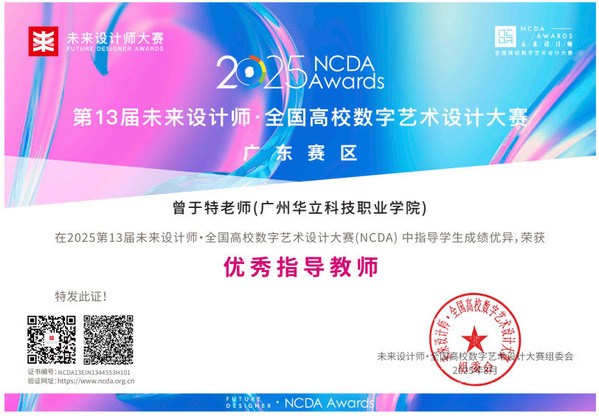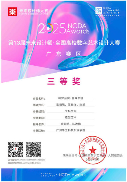 九、2025年8月,未來設計師·全國高校數(shù)字藝術設計大賽(NCDA)是入選《全國普通高校大學生競賽排行榜》,近20家省教育廳認定,“學習強國”學習平臺支持,對接聯(lián)合國國際賽的全國性大學生競賽。是高校教育教學改革和創(chuàng)新人才培養(yǎng)的重要競賽項目之一,具有極高的知名度與影響力。在第13屆未來設計師·全國高校數(shù)字藝術設計大賽(NCDA)中,藝術與傳媒學院師生在廣東省賽區(qū)共獲獎12項。其中,我校獲得優(yōu)秀組織單位獎1項;學生組“一等獎”2項,“三等獎”2項;教師組“一等獎”1項,“三等獎”1項;“優(yōu)秀指導教師獎”4項;“優(yōu)秀組織教師獎”1項。