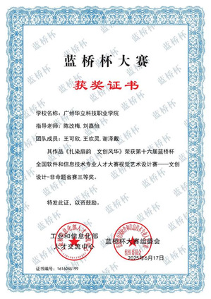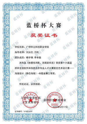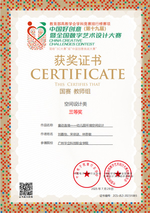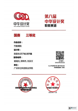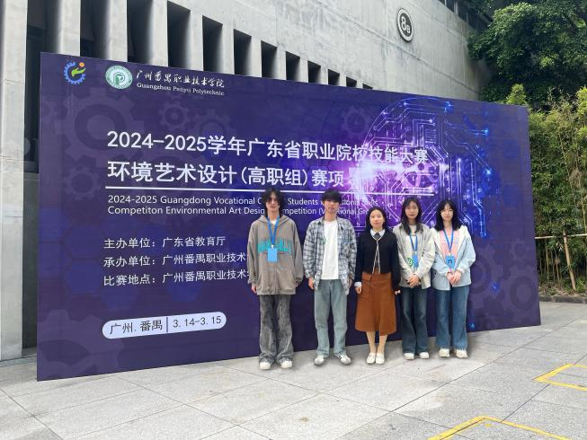 二、2025年4月,由廣東省教育廳主辦、廣州番禺職業(yè)技術學院承辦的2024—2025學年廣東省職業(yè)院校技能大賽環(huán)境藝術設計賽項,藝傳學子謝梁英、鐘曉婷、謝志煒、黎永豪在馬英超、謝瑞祥老師指導下,最終在全省65支參賽隊伍、200多名選手中脫穎而出,榮獲“三等獎”。