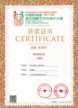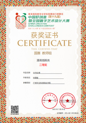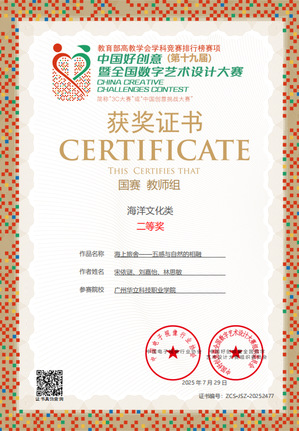 七、2025年7月,中國好創(chuàng)意暨全國數(shù)字藝術設計大賽,簡稱“中國創(chuàng)意挑戰(zhàn)大賽”,是教育部中國高等教育學會《全國普通高校學科競賽分析報告》收錄的權威賽事。作為國內首個以數(shù)字藝術為核心、將賽事提升至哲學高度,并提供投稿免費存證服務的專業(yè)競賽,吸引眾多高校參與,影響力廣泛,已成為高校藝術創(chuàng)意領域的重要風向標。第十九屆中國好創(chuàng)意暨全國數(shù)字藝術設計大賽藝術與傳媒學院教師斬獲國賽“一等獎”1項、“二等獎”3項、“三等獎”4項的優(yōu)異成績。充分彰顯我校教師在數(shù)字藝術創(chuàng)作、技術應用與教學改革中的綜合實力。