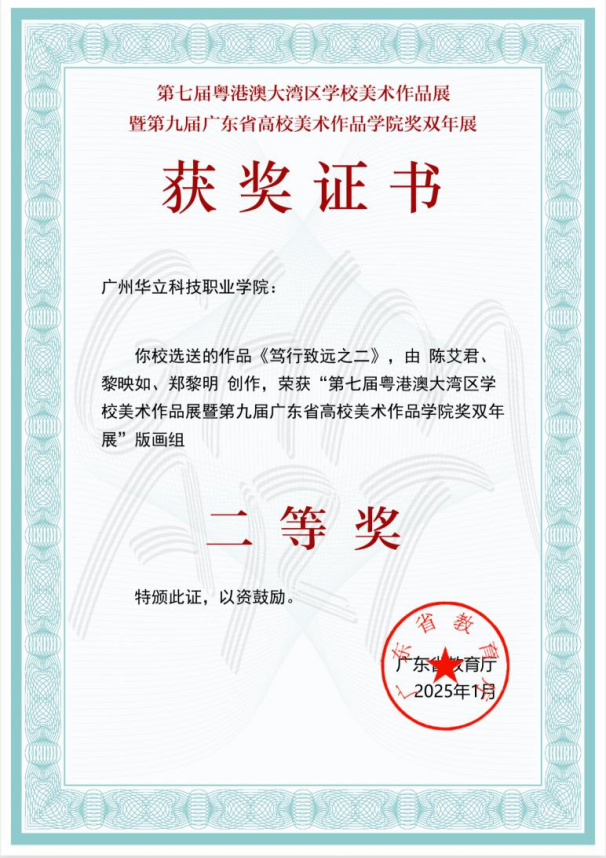 一、2025年1月,廣東省教育廳頒發(fā)了第七屆粵港澳大灣區(qū)學校美術作品展暨第九屆廣東省高校美術作品學院獎雙年展的獲獎證書。其中,陳艾君、黎映如、鄭黎明三位教師共同創(chuàng)作的版畫作品《篤行致遠之二》榮獲“二等獎”,唐青教師的作品《金牛?;⒌歉叻濉穭t榮獲“三等獎”。這些榮譽不僅是對教師個人藝術造詣的高度肯定,更凸顯了學院教師在藝術創(chuàng)作上風格多元、勇于創(chuàng)新的特質。