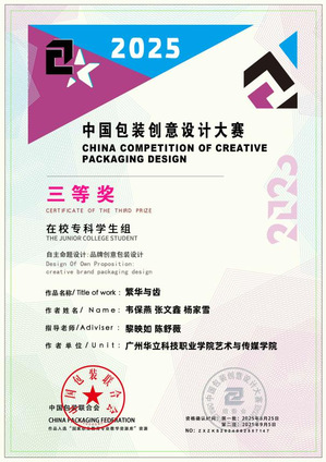 六、2025年7月,“全國大學生廣告藝術大賽”作為國內規(guī)模龐大、覆蓋面廣、極具影響力的高校文科競賽,始終致力于激發(fā)大學生的創(chuàng)新活力與實踐能力。2025年第17屆全國大學生廣告藝術大賽(大廣賽)廣東賽區(qū)藝術與傳媒學院選送作品中《繁花與齒》在產(chǎn)品與包裝設計類別中脫穎而出,其創(chuàng)意構思與視覺呈現(xiàn)獲得了賽事評委的高度認可,成功斬獲省級“三等獎”。