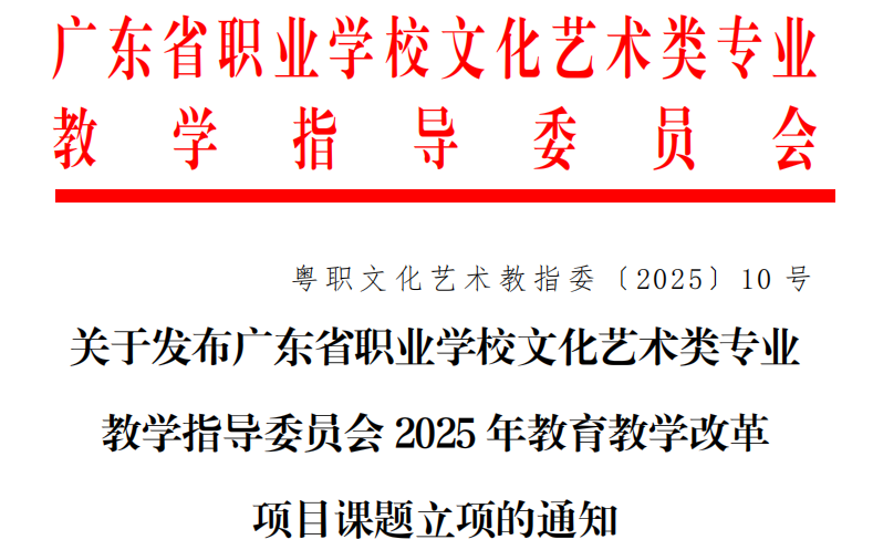 近日,廣東省職業(yè)學(xué)校文化藝術(shù)類(lèi)專(zhuān)業(yè)教學(xué)指導(dǎo)委員會(huì)發(fā)布了《關(guān)于公布2025年教育教學(xué)改革項(xiàng)目立項(xiàng)名單的通知》(粵職文化藝術(shù)教指委0〔2025〕10號(hào))。藝術(shù)與傳媒學(xué)院多項(xiàng)課題成功獲批立項(xiàng),涵蓋數(shù)字藝術(shù)、人工智能應(yīng)用、非遺傳承等多個(gè)前沿與熱點(diǎn)方向,彰顯了學(xué)院在文化藝術(shù)類(lèi)專(zhuān)業(yè)教育教學(xué)改革方面的積極探索與雄厚實(shí)力。