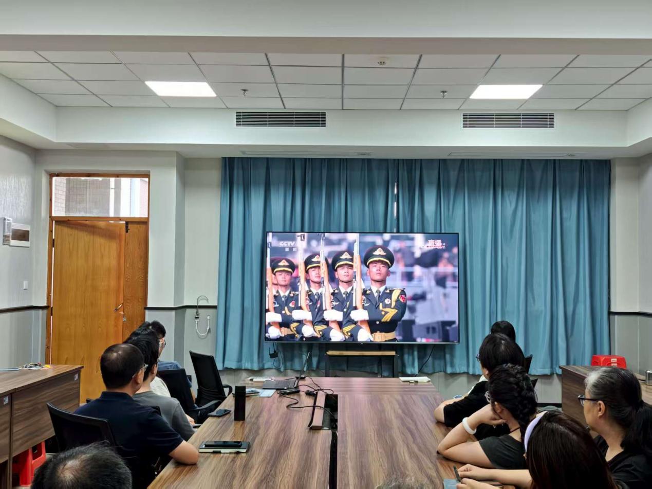 (圖一學(xué)院教師在會(huì)議室觀看閱兵)