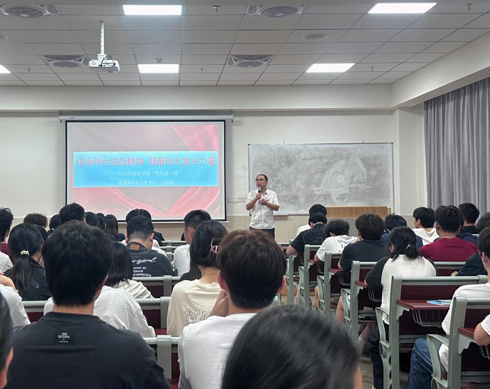 2025年10月14日,城建學院黨總支書記吳毅強在第二教學樓408教室,為24級、25級各專業(yè)學生講授以“傳承偉大抗戰(zhàn)精神 凝聚偉大復興力量”為主題的“思政第一課”,引導青年學子從抗戰(zhàn)歷史中汲取精神力量,錨定民族復興使命。