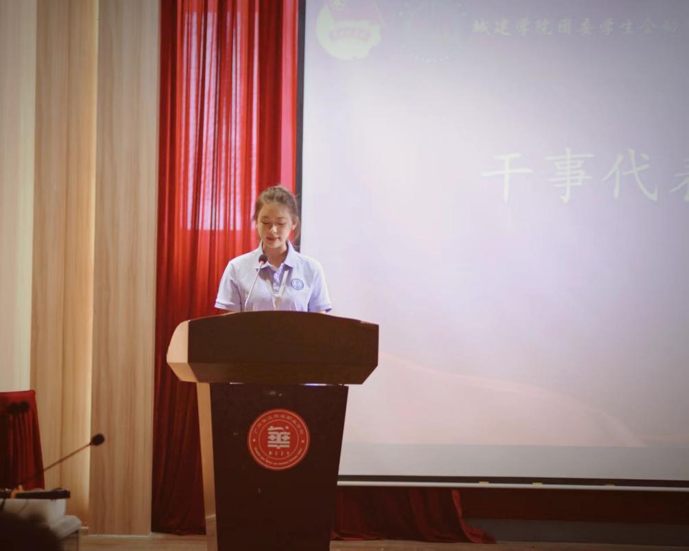 干事代表黃欣瑩身著會服,以飽滿的精神狀態(tài)登臺發(fā)言。言辭懇切、意氣風(fēng)發(fā),不僅表達(dá)了對加入團(tuán)委學(xué)生會大家庭的榮幸與喜悅,更展現(xiàn)出投身學(xué)生工作、服務(wù)集體發(fā)展的滿腔熱忱,讓現(xiàn)場感受到新生力量的蓬勃朝氣與無限潛能。