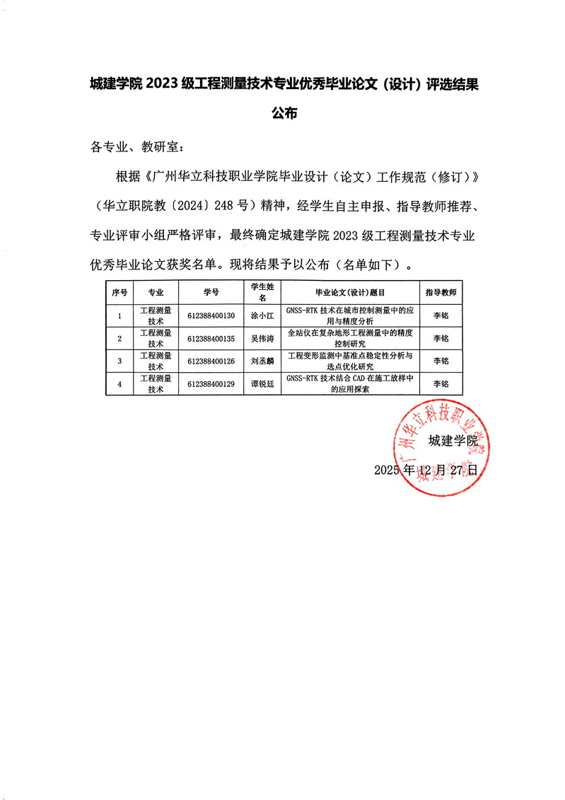 城建學院2023級工程測量技術專業(yè)優(yōu)秀畢業(yè)論文(設計)評選公布