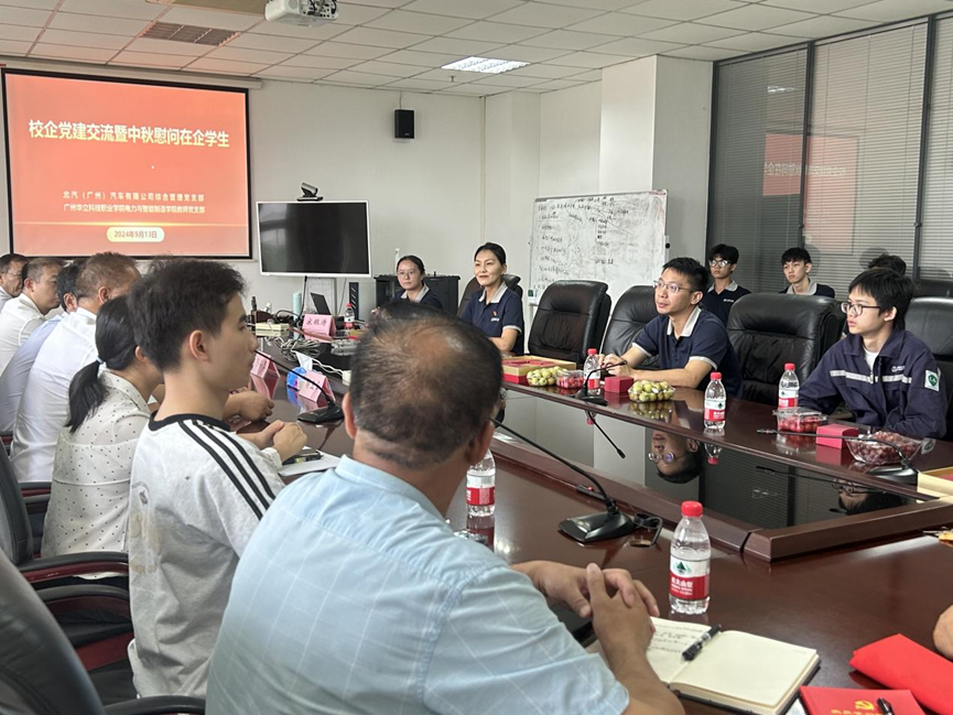 學(xué)院教師黨支部與北汽(廣州)汽車有限公司綜合管理黨支部是黨建結(jié)對共建單位。在中秋佳節(jié)到來之際,9月13日上午,學(xué)院教師黨支部書記孫令真帶領(lǐng)學(xué)院沒有課的8位黨員教師,到北汽(廣州)汽車有限公司進行黨建交流學(xué)習(xí)和中秋慰問在企學(xué)生。學(xué)院黨總支書記褚玉峰,北汽(廣州)汽車有限公司綜合管理黨支部副書記黃建安、人力運營經(jīng)理李婷婷、人事員陳晶及我校在企學(xué)生代表參加了會議。