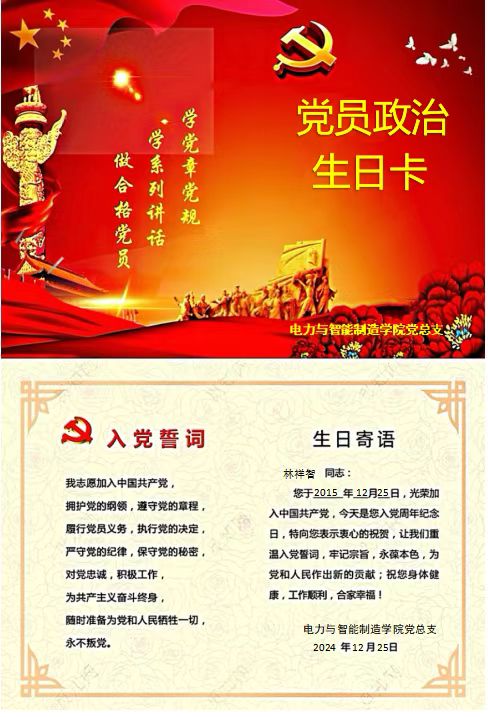 時(shí)光荏苒,如白駒過隙,在忙碌與奮進(jìn)中,12月25日迎來了屬于自己的一個(gè)特殊日子——“政治生日”,作為電力與智能制造學(xué)院黨總支教師黨支部的一名教師黨員林祥智,在這特殊的時(shí)刻,不僅是對(duì)個(gè)人黨員政治生涯的一次回顧,更是黨性修養(yǎng)再度升華的重要契機(jī)。