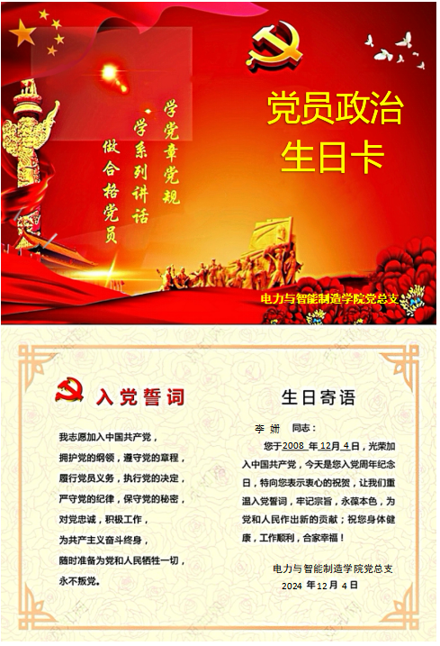 作為電力與智能制造學(xué)院的一名黨員教師李?yuàn)?/span>,在收到學(xué)院黨組織發(fā)來的“政治生日”賀卡,我的心情特別興奮,也感謝組織的關(guān)懷。12月4日,是我的政治生日,我認(rèn)為政治生日是表達(dá)對(duì)黨的忠誠和堅(jiān)定的重要時(shí)刻。