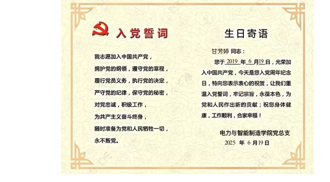 2025年6月19日,作為電力與智能制造學(xué)院云浮校區(qū)的教師黨員,收到了黨組織送來(lái)的“政治生日”賀卡。這一天,于我而言,意義非凡。它不僅是我政治生日的莊嚴(yán)誕辰,更像是一座永不熄滅的燈塔,照亮信仰的征程,讓象征著理想與信念的火種,在歲月的長(zhǎng)河中生生不息,始終散發(fā)著溫暖而堅(jiān)定的光芒。在教育教學(xué)的道路上和探索中,在服務(wù)師生的點(diǎn)滴日常里,推動(dòng)著我無(wú)畏向前,永不停歇。