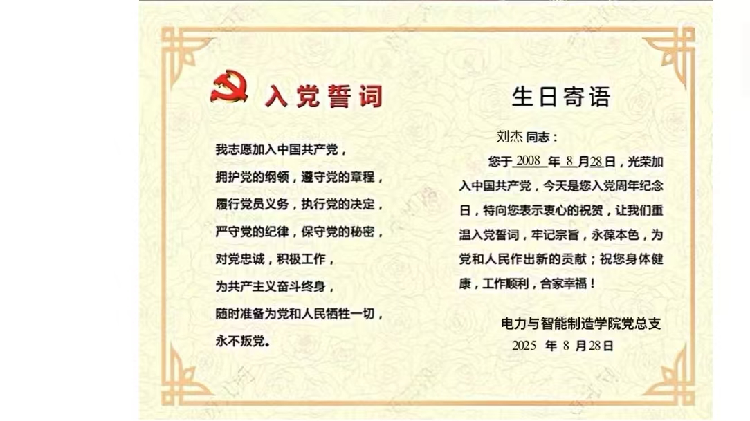 作為電力與智能制造學(xué)院教師黨支部的一名教師黨員劉杰828日早上收到了學(xué)院黨組織發(fā)的“政治生日”賀卡,心情特別興奮,轉(zhuǎn)眼間,加入中國共產(chǎn)黨已經(jīng)17。