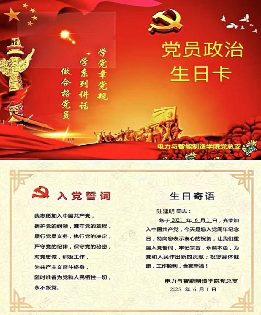 作為電力與智能制造學(xué)院的一名教師黨員陸建明,6月1日早上,收到了學(xué)院黨組織的發(fā)“政治生日”賀卡,心情特別興奮,6月1日是我加入中國共產(chǎn)黨的日子。