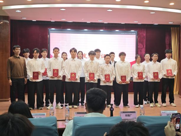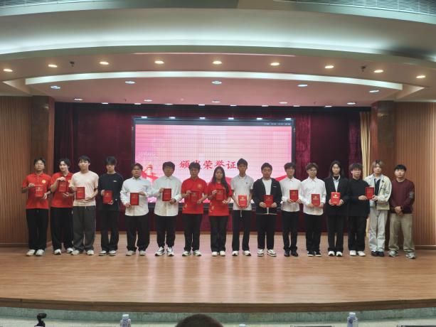 (學(xué)院黨總支書記褚玉峰、黨總支專職副書記鄭理廣、學(xué)生黨建工坊指導(dǎo)老師王凱為獲獎隊伍頒獎)