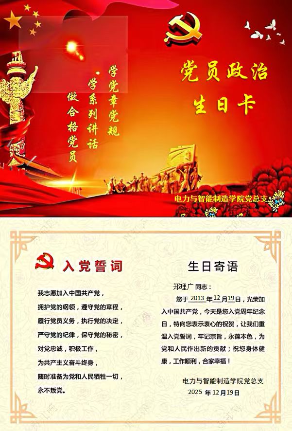 作為電力與智能制造學院黨員教師鄭理廣,12月19日,在收到學院黨組織發(fā)來的“政治生日”賀卡,我的內心倍感溫暖與振奮,深深感謝黨組織的關懷與厚愛。這個日子對我而言,這不僅是時間的標記,更是初心的回溯、信仰的錘煉,時刻提醒我,身為黨員教師,要把對黨忠誠融入立德樹人、為黨育人的行動中。