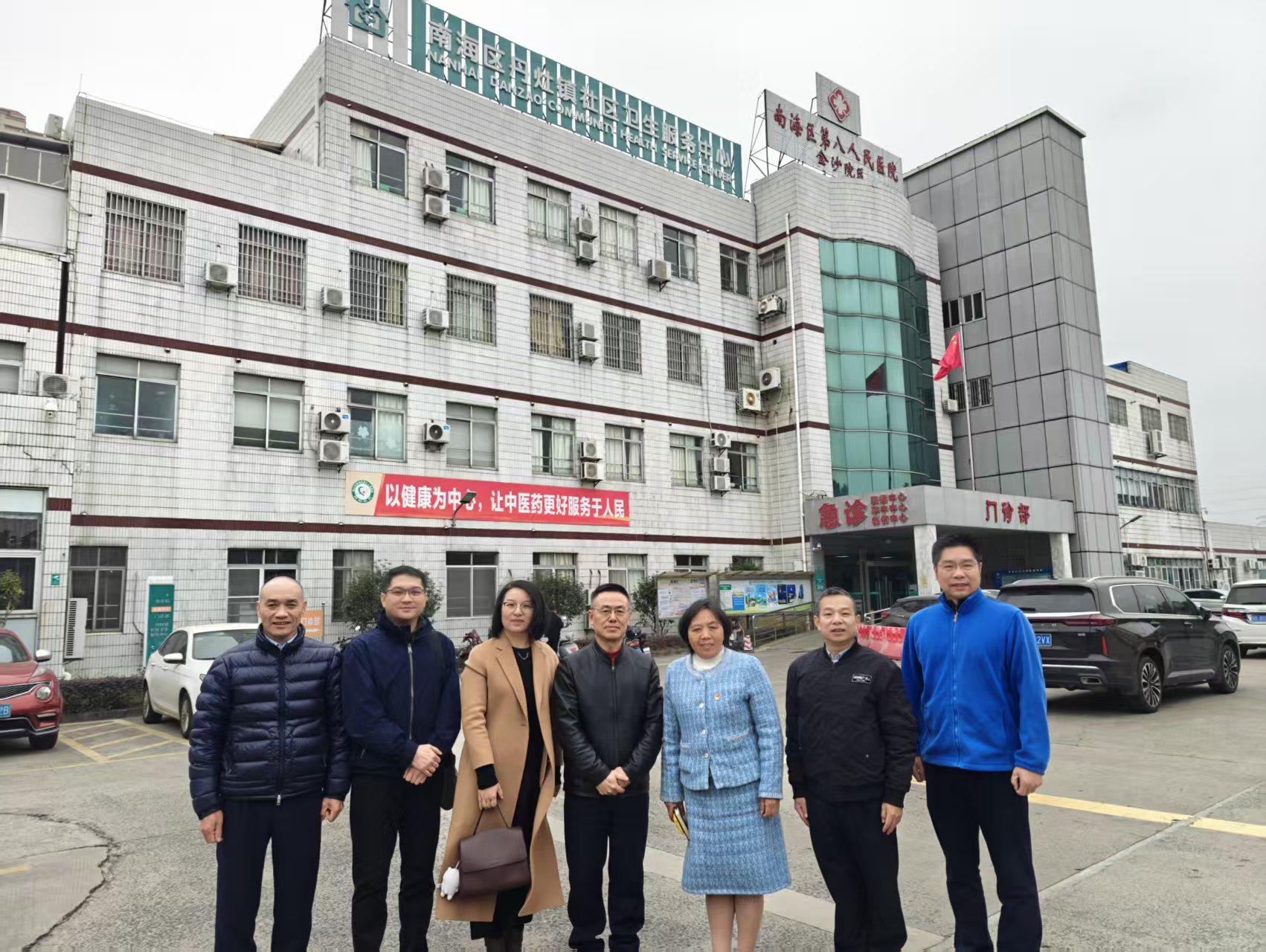 健康學院羅琴芳博士參觀兒童一體化門診,與丹灶社區(qū)衛(wèi)生服務(wù)中心何立華主任等負責人樓前合影