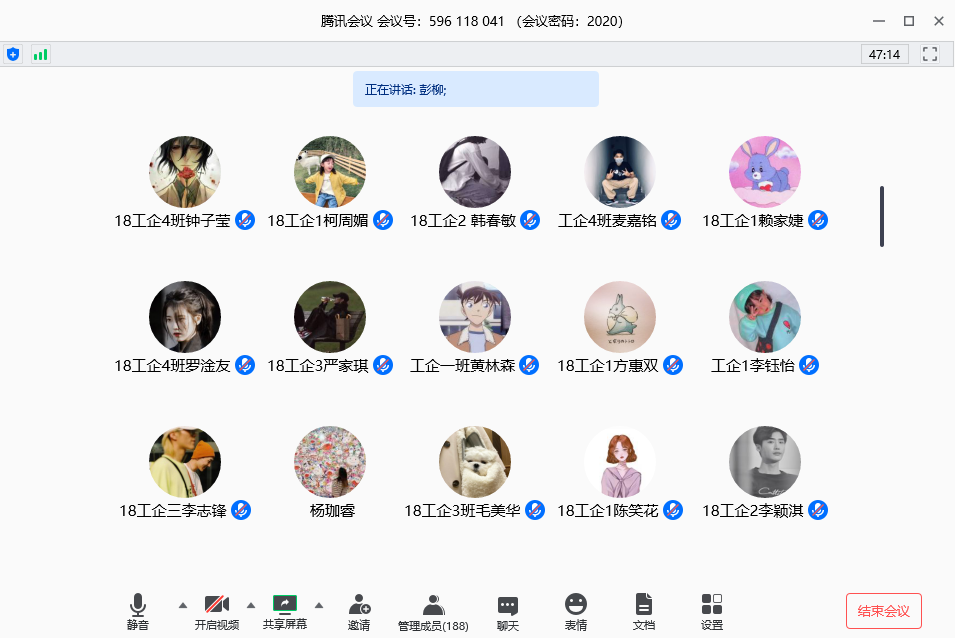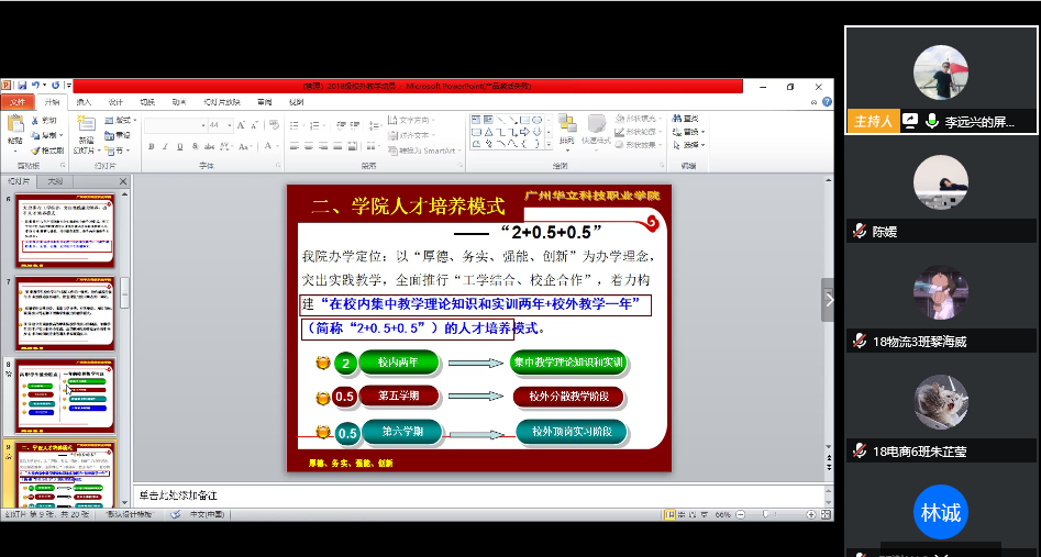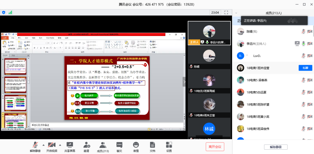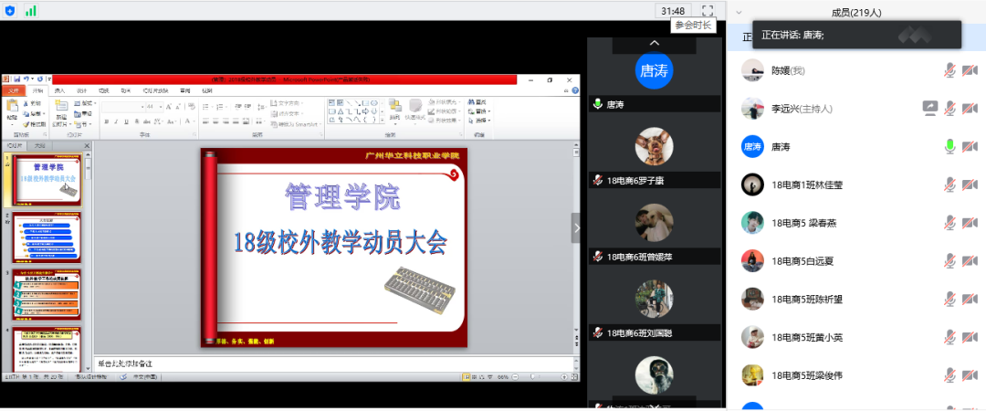 2020年4月29日管理學院通過騰訊會議直播的方式開展線上2018級校外教學動員大會。我院物流管理,工商企業(yè)管理,電子商務和市場營銷專業(yè)分四批次進行視頻直播方式動員。我院彭柳副院長、張良衛(wèi)教授、學生管理唐濤副主任、校外教學李遠興副主任、陳媛輔導員、戴雙雅輔導員、梁冰實習輔導員以及2018級全體同學參加了四場動員會。動員大會由校外教學李遠興副主任主持。