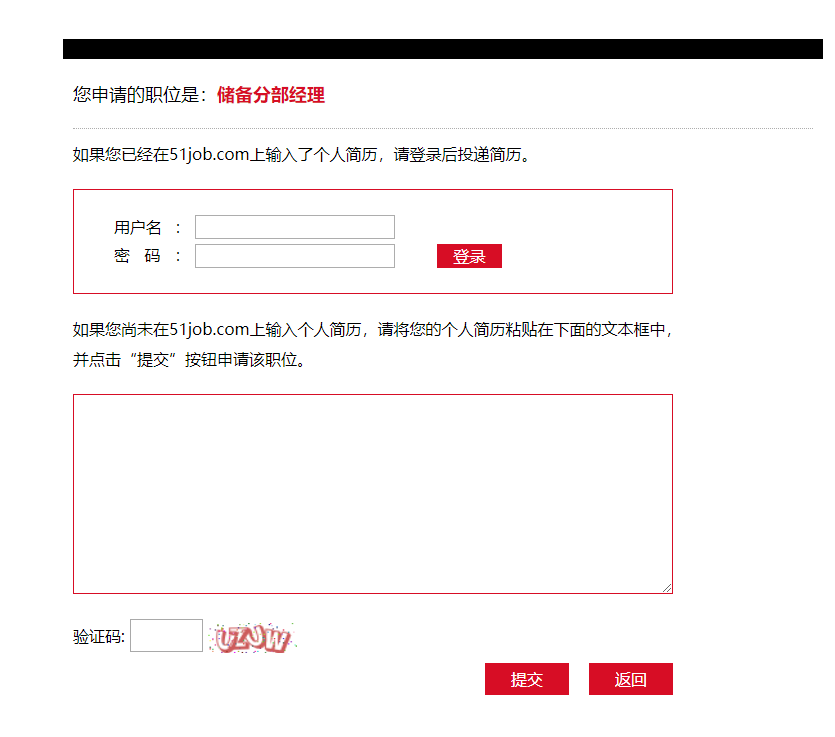 重新輸入自己的用戶名和密碼登錄,系統(tǒng)即可將你的簡歷投到招聘的公司。如果還沒有填寫簡歷,先在下方的空白處填寫簡歷并提交,再填寫賬號密碼登錄投簡歷。