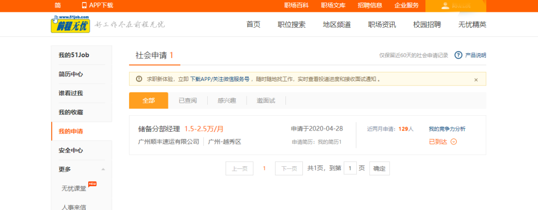 最后,在頁面右上角處點擊自己的名字,再點擊左側的“我的申請”,可查看自己正在申請的職位。