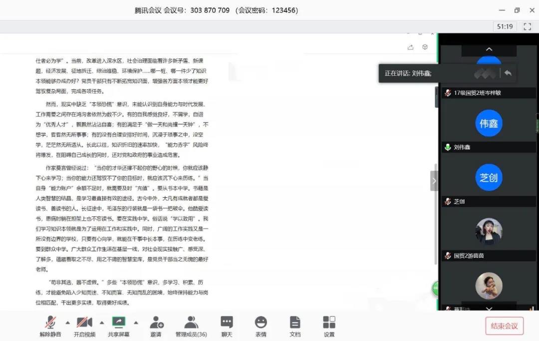 會(huì)議的最后由國貿(mào)學(xué)院黨總支第二黨支部書記劉偉鑫老師給大家分享了報(bào)道林雍同志《領(lǐng)導(dǎo)干部多些“本領(lǐng)恐慌”的意識(shí)》的文章。此篇文章中提到了:年輕干部要多些“本領(lǐng)恐慌”意識(shí),通過不斷加強(qiáng)學(xué)習(xí)提升自身能力素質(zhì),做有準(zhǔn)備的人,多些“本領(lǐng)恐慌”意識(shí)是時(shí)代發(fā)展的要求?!捌埛瞧溥x,器不虛假?!倍嘈氨绢I(lǐng)恐慌”意識(shí),多學(xué)習(xí)、積累、歷練,才能避免陷入少知而迷、不知而盲、無知而亂的困境,始終保持能力與崗位相匹配,干出更多實(shí)績(jī),取得更好成績(jī)。