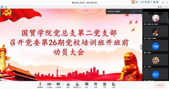 2020年5月7日晚上8:00,國貿學院在騰訊會議平臺開展了第26期黨校培訓班開班動員大會,參加本次會議的有國貿學院黨總支第二黨支部書記劉偉鑫老師、國貿學院黨總支黨建小組指導老師陳曉薇老師以及國貿學院第26期黨校培訓學員。