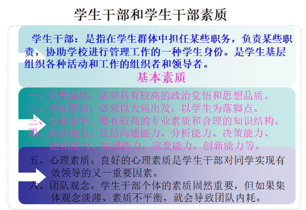 第二講由鄭慶國老師授之“學(xué)生干部的素質(zhì)培養(yǎng)及領(lǐng)導(dǎo)力提升”課程。首先,鄭慶國老師強(qiáng)調(diào)作為一名學(xué)生干部的基本素質(zhì)和應(yīng)盡的職責(zé)。接著指出,應(yīng)該做到學(xué)習(xí)工作兩不誤,合理的安排兩者之間的時(shí)間。隨后講到作為學(xué)生干部應(yīng)該如何工作更加的合理和學(xué)生干部應(yīng)該怎么做做出了要求。最后,鄭慶國老師提醒學(xué)生干部現(xiàn)在應(yīng)該要做的三件事情,分別是:行動(dòng),規(guī)劃和調(diào)整。目的是讓學(xué)生干部在大學(xué)生活里不要迷茫,讓學(xué)生干部要明確自己的目標(biāo)和計(jì)劃,有了計(jì)劃就要付出行動(dòng),這樣的大學(xué)生活才不會(huì)迷茫,才有方向。