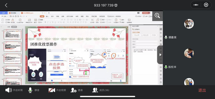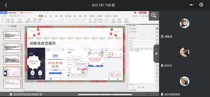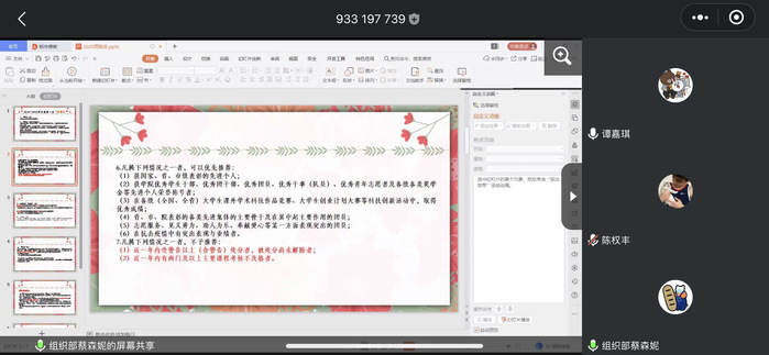 國貿學院團總支學生會組織部部長蔡森妮同學詳細向18、19級團支書介紹了有關團推優(yōu)需要注意的事項:一、本次團推優(yōu)對象為我校在讀的18、19級團員,參與團推優(yōu)者需要符合團推優(yōu)的基本條件才可進行團推優(yōu)。二、各個團支部有一定的團推優(yōu)人數(shù),在團推優(yōu)過程中要公平公正不能出現(xiàn)包庇、爭鋒相對的現(xiàn)象。三、團推優(yōu)和團支部大會的程序:由于疫情影響,今年的團推優(yōu)程序在線上開展,由團支部召開支部團員大會。