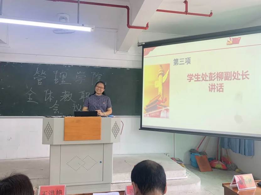 會議第三項,學(xué)生處彭柳副處長發(fā)表講話,她先是表達(dá)了對管理學(xué)院的不舍和感恩,然后又對一起共事的管院同志們致以感謝,同時也希望管理學(xué)院在新領(lǐng)導(dǎo)的引領(lǐng)下更進(jìn)一步,將管院黨建隊伍發(fā)揚(yáng)光大。